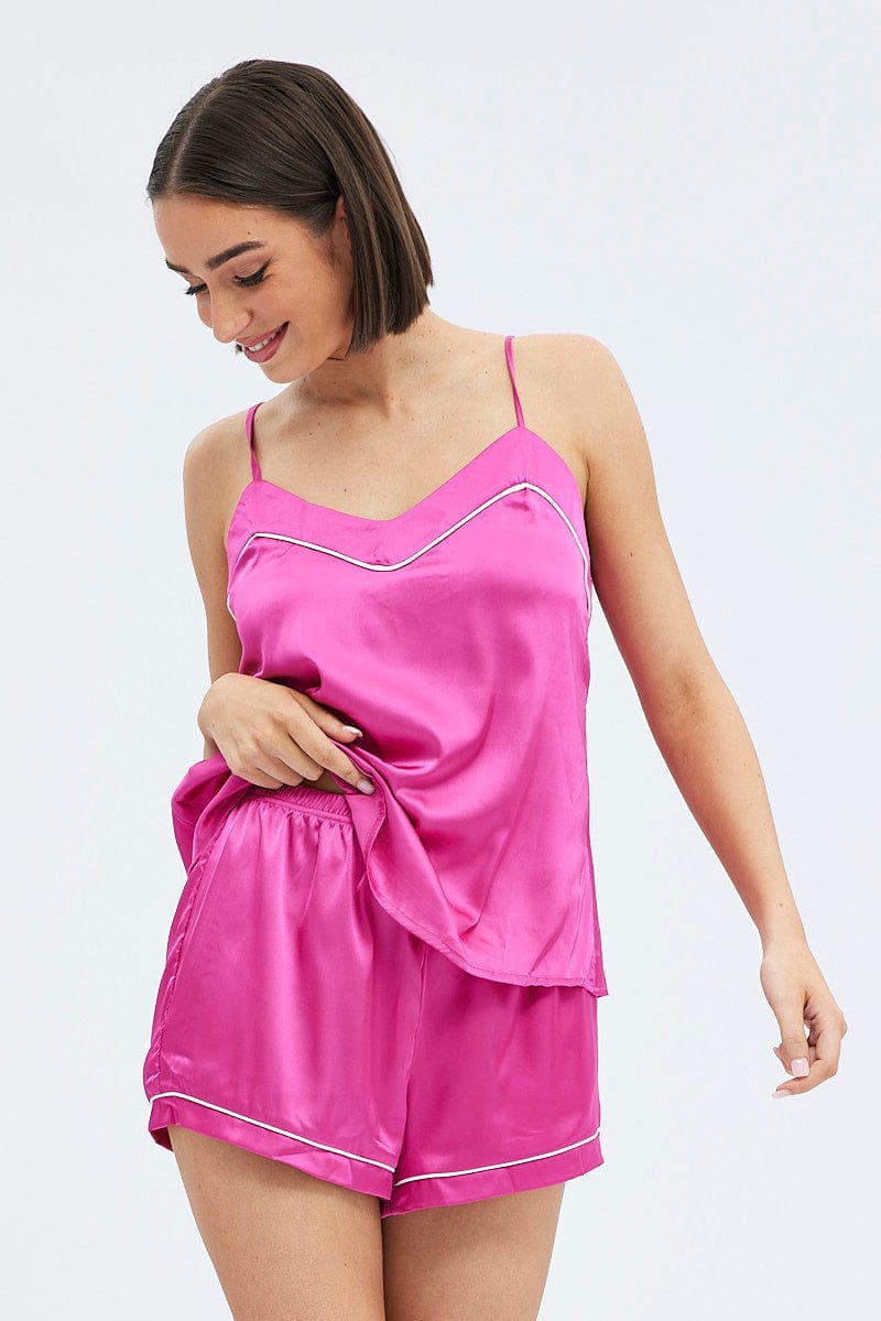 Pink Cami PJ Contrast Piping Satin Pyjama Set
