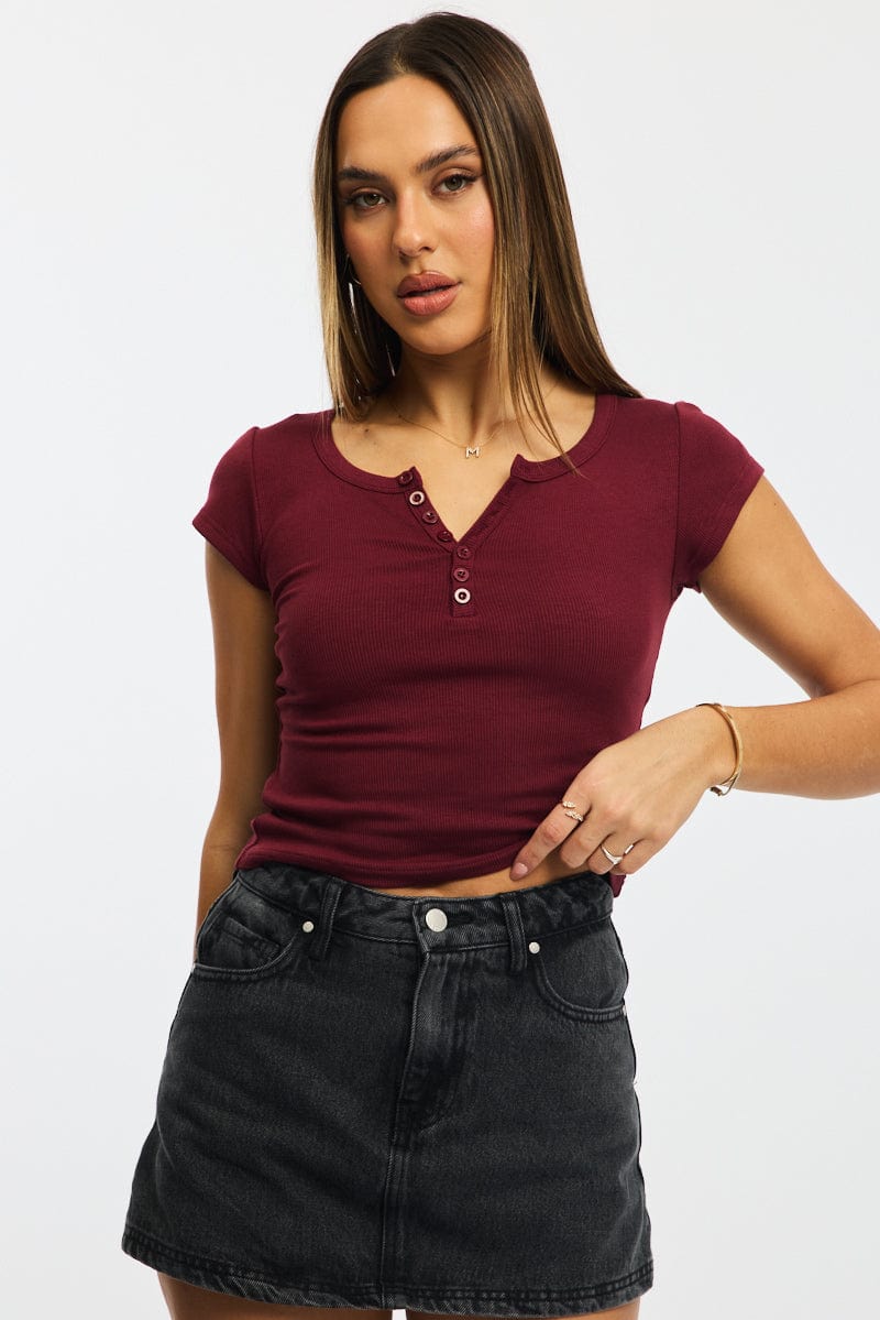 Red Button Down Tee Short Sleeve Rib